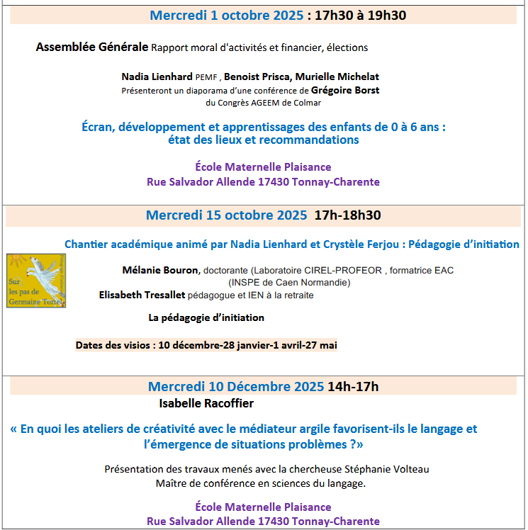 Nous portons à votre connaissance le calendrier des actions et des événements portés par l’A.G.E.E.M. (Association Générale des Enseignants des Écoles et classes Maternelles Publiques). Le « fil conducteur » de l’année 2025/2026 s’articulera autour de la thématique « Apprendre à l’école, mais où est le problème ? ».