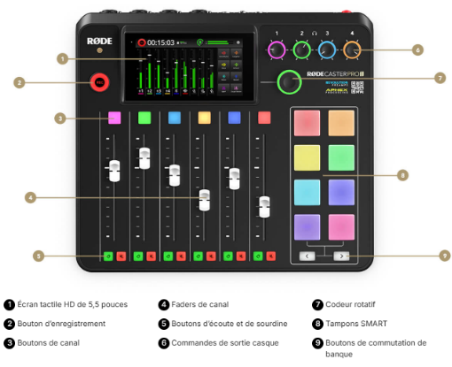 https://rode.com/fr-fr/user-guides/rodecaster-pro-ii Premier démarrage Importer un son sur le cartoucheur Configuration des sons sur le cartoucheur Enregistrer Exporter un enregistrement